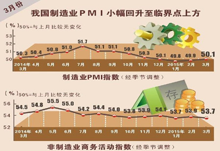 3月制造業PMI為50.1% 重回榮枯線上方2015年3月,隨著春節后企業開工增加,以及國家穩增長政策對市場預期的改善,中國制造業采購經理指數(PMI)為50.1%,比上月小幅回升0.2個百分點,重回臨界點上方。 [詳細]