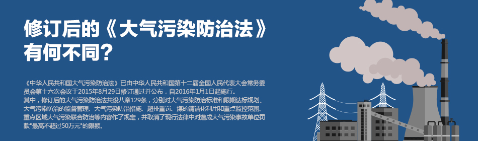 8月29日,重新修訂后的《中華人民共和國(guó)大氣污染防治法》由第十二屆全國(guó)人民代表大會(huì)常務(wù)委員會(huì)通過(guò),自2016年1月1日起施行。【詳細(xì)】