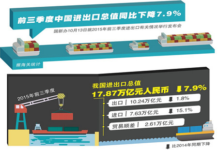 前三季度中國進出口總值17.87萬億元 同比降7.9%據海關統計,2015年前三季度我國進出口總值17.87萬億元人民幣,比去年同期下降7.9%。其中,出口10.24萬億元,下降1.8%;進口7.63萬億元,下降15.1%;貿易順差2.61萬億元,擴大82.1%。 [詳細]