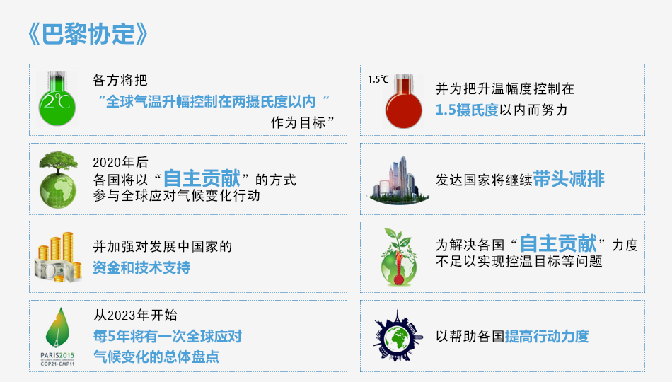 《巴黎協定》涵蓋長期目標、減排目標、資金援助、透明度審查、損失評估等多項內容。根據協定,各締約國要把全球平均氣溫上升幅度控制在2攝氏度以內,并在此基礎上再做出升幅小于1.5攝氏度的努力。 [詳細]