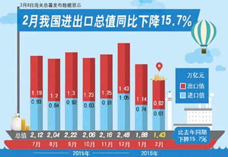外貿“低調”進入“十三五” 遏制出口下行任務嚴峻海關總署8日發布數據顯示,今年前2個月我國進出口總值同比下降12.6%,其中2月份單月出口降幅進一步加大,顯示國際市場需求未現好轉跡象,遏制出口下行的任務比較嚴峻。 [詳細]