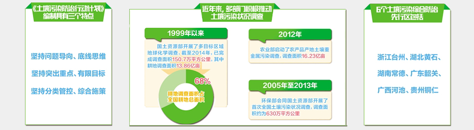 工作目標:到2020年,全國土壤污染加重趨勢得到初步遏制,土壤環境質量總體保持穩定,農用地和建設用地土壤環境安全得到基本保障,土壤環境風險得到基本管控。到2030年,全國土壤環境質量穩中向好,農用地和建設用地土壤環境安全得到有效保障,土壤環境風險得到全面管控。到本世紀中葉,土壤環境質量全面改善,生態系統實現良性循環。