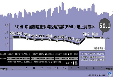 5月制造業(yè)PMI數(shù)據(jù)解析:需求依然偏弱國(guó)家統(tǒng)計(jì)局等部門(mén)1日公布的數(shù)據(jù)顯示,5月份中國(guó)制造業(yè)采購(gòu)經(jīng)理指數(shù)(PMI)為50.1%,與上月持平,連續(xù)三個(gè)月位于50%以上的擴(kuò)張區(qū)間,保持基本穩(wěn)定走勢(shì)。 [詳細(xì)]