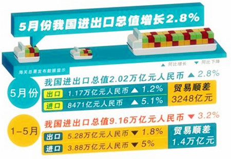 5月份我國(guó)進(jìn)出口總值增長(zhǎng)2.8%海關(guān)總署發(fā)布數(shù)據(jù),5月份我國(guó)進(jìn)出口總值2.02萬(wàn)億元人民幣,比去年同期增長(zhǎng)2.8%。1至5月,我國(guó)進(jìn)出口總值9.16萬(wàn)億元人民幣,同比下降3.2%,降幅較前4個(gè)月收窄1.6個(gè)百分點(diǎn)。其中,出口5.28萬(wàn)億元、進(jìn)口3.88... [詳細(xì)]