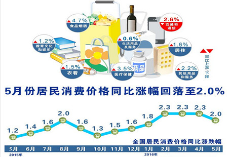 5月份CPI同比增長(zhǎng)2%2016年5月份,全國(guó)居民消費(fèi)價(jià)格總水平同比上漲2.0%。其中,城市上漲2.0%,農(nóng)村上漲2.1%;食品價(jià)格上漲5.9%,非食品價(jià)格上漲1.1%;消費(fèi)品價(jià)格上漲2.0%,服務(wù)價(jià)格上漲2.1%。1-5月平均,全國(guó)居民消費(fèi)價(jià)... [詳細(xì)]