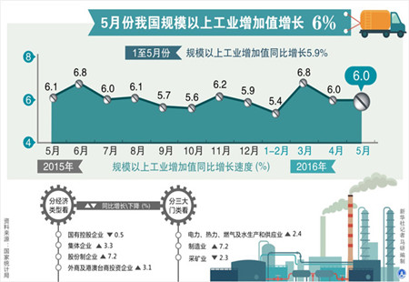 5月規(guī)模以上工業(yè)增加值增長(zhǎng)6.0%2016年5月份,規(guī)模以上工業(yè)增加值同比實(shí)際增長(zhǎng)6.0%(以下增加值增速均為扣除價(jià)格因素的實(shí)際增長(zhǎng)率),與4月份持平。從環(huán)比看,5月份,規(guī)模以上工業(yè)增加值比上月增長(zhǎng)0.45%。1-5月份,規(guī)模以上工業(yè)增加值同比增長(zhǎng)5.9... [詳細(xì)]